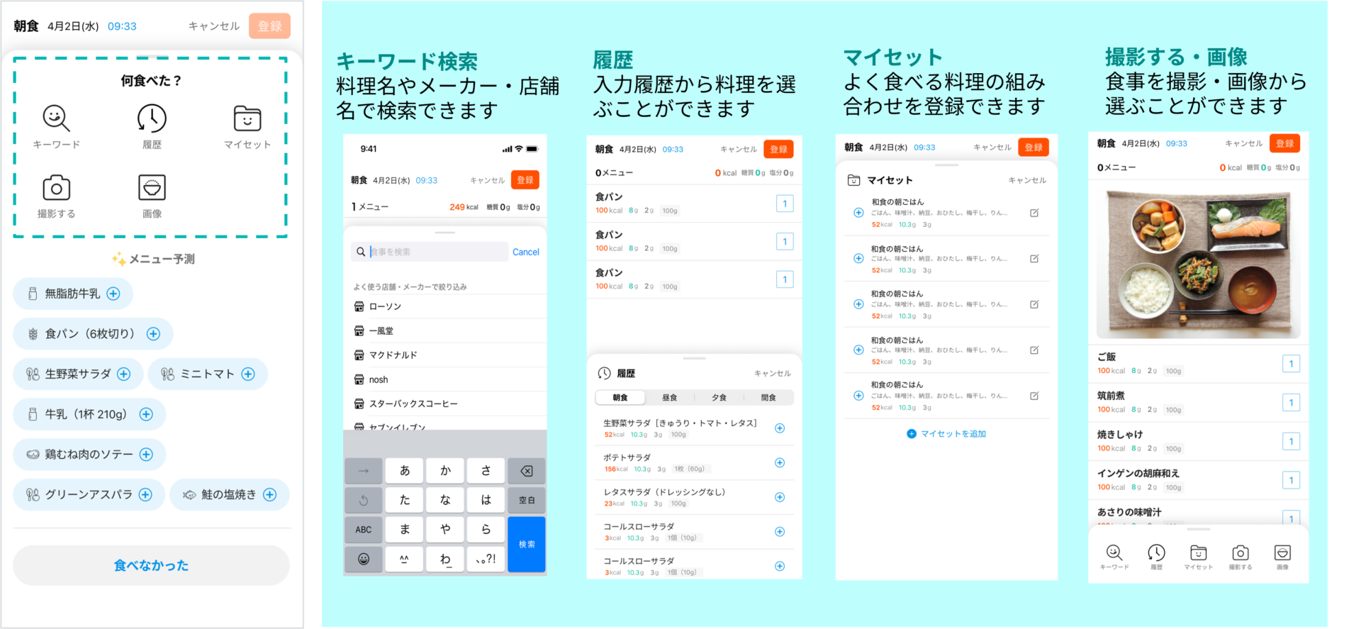 料理名やメーカー名・店舗名などのキーワード検索に加え、食事の写真を撮るなど様々な方法で食事記録ができます。