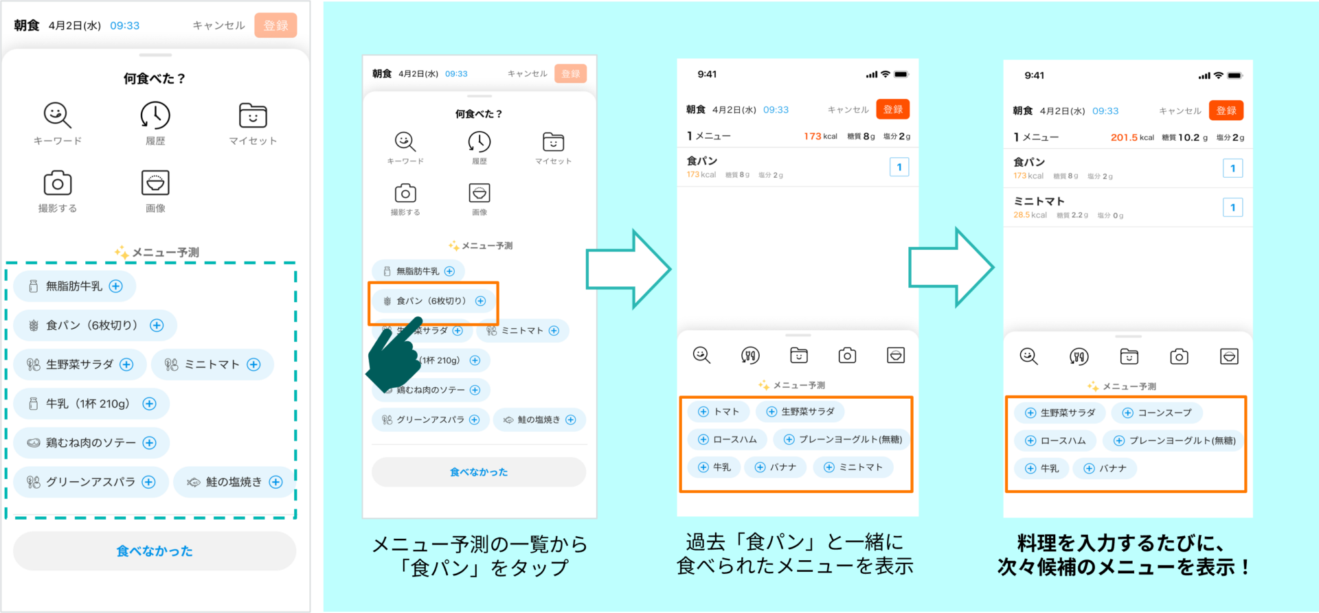この機能では、これまでの食事の記録内容をもとに、ユーザーがよく食べている料理や、組み合わせて食べることの多いメニューをAIが予測し、入力候補としてリストアップします。