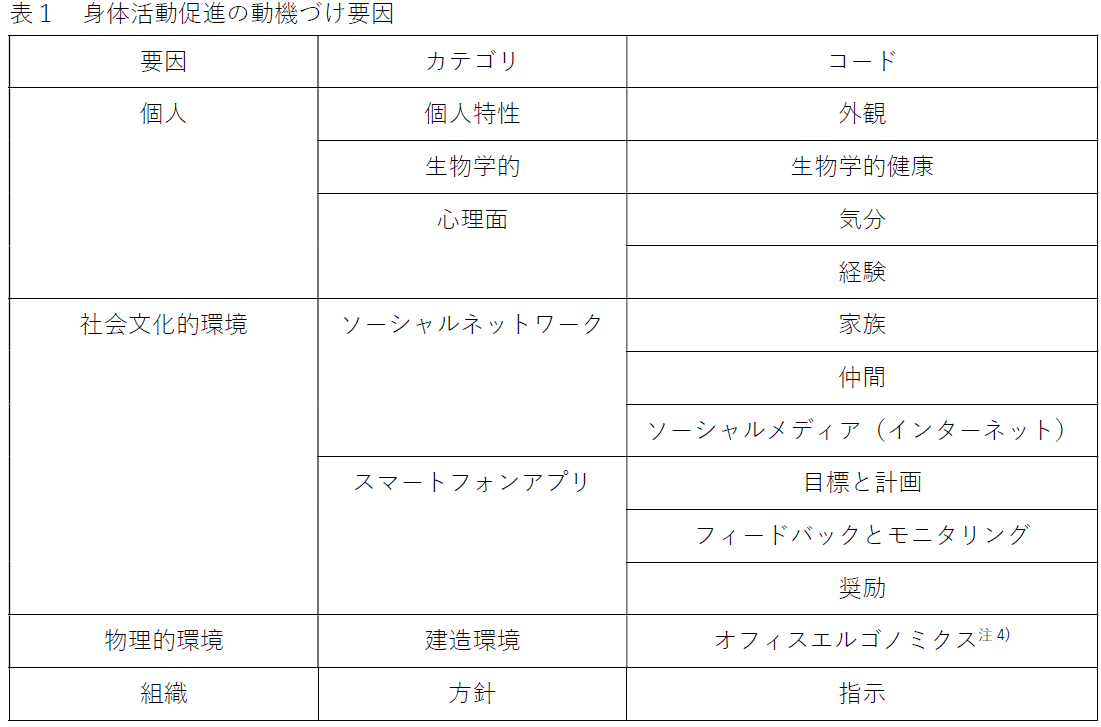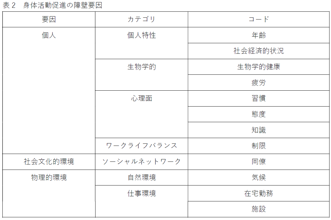 得られた発言内容についてテーマ分析を用い、質問①は帰納的に、質問②③は社会生態学モデル注3)に基づいてコード化(質的分類)しました(表1、2)。その結果、参加者は「身体活動」という単語は認知していなかったものの、「日常の動きを増やすこと」や「座位時間を減らすこと」の重要性は理解していました。また、動機づけ要因としては、気分の改善や運動後の達成感、体の見た目の変化のような個人要因のほか、家族の支援などの社会文化的要因も挙げられました。健康管理アプリの機能としては、目標設定、フィードバック、リマインド、褒め言葉などに対する期待が示されました。さらに、体調や生活スケジュール、天候などの状況に応じた個別化提案が望まれていました。一方、阻害要因としては、仕事や家事による時間的制約、疲労、天候が多く挙げられました。加えて、テレワークによる座位時間の増加や、職場で身体活動を行う際の周りの人の目などの意見もありました。